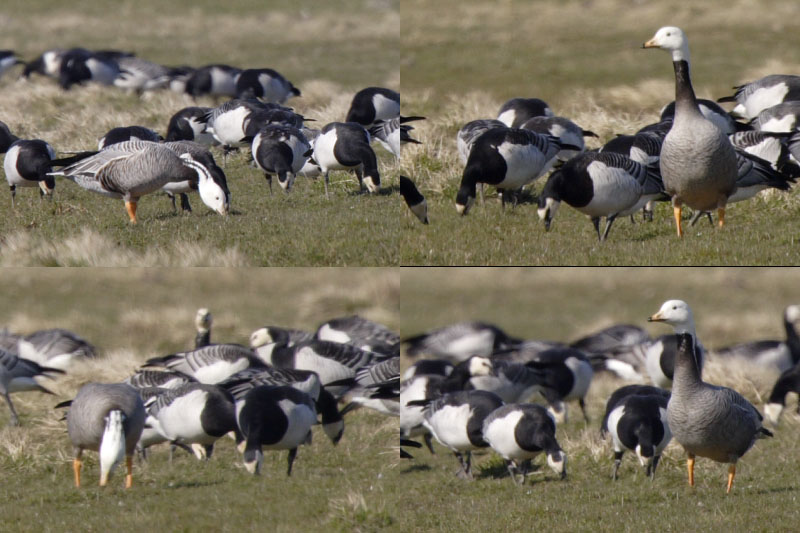 Der er klart mest Indisk Gås over den aktuelle gås. Men af billederne fremgår det ikke særligt tydeligt, at undergumpen var kraftigt meleret med mørke tegninger og derfor gav klare associationer til Kejsergås. Af andre indikationer på Kejsergås sås det hvide hoved og den meget mørke forhals og den næsten renhvide baghals, der kun var afbrudt af en tynd længdegående sort stribe, hvorved tre tynde sorte striber sås ned ad halsen, når fuglen sås direkte bagfra.