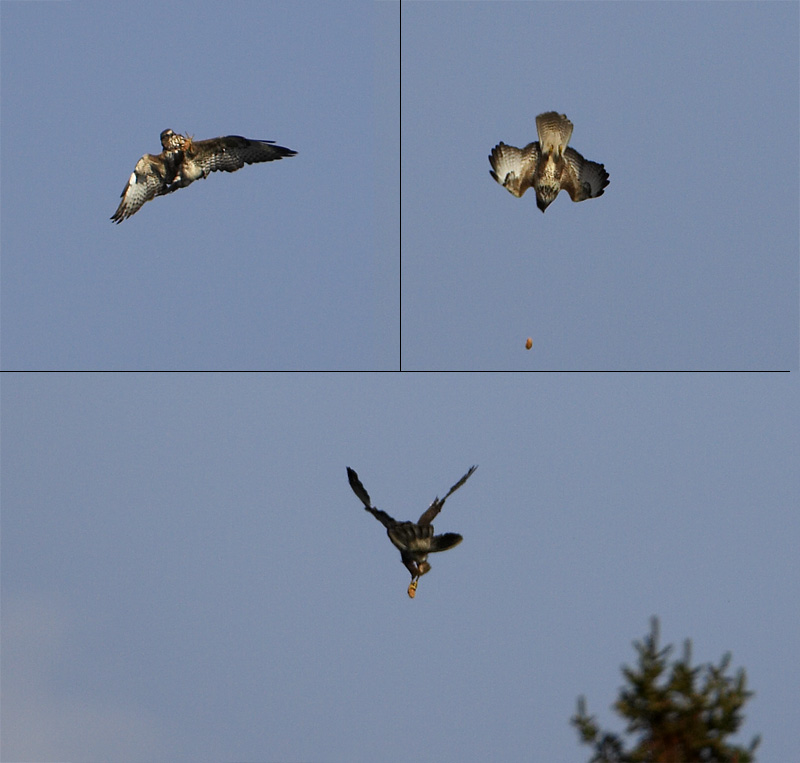 Beskrivelse: Musvågen blærede sig overfor sin mage med at droppen en mus og så snuppe den igen inden den ramte jorden.