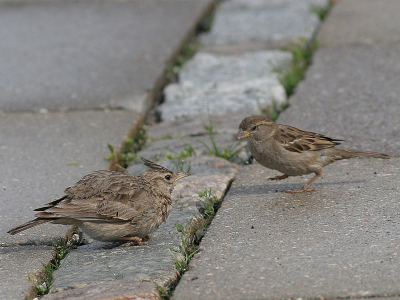 Beskrivelse: Gråspurv hun nærgående overfor Københavns første stationære Toplærke i flere år