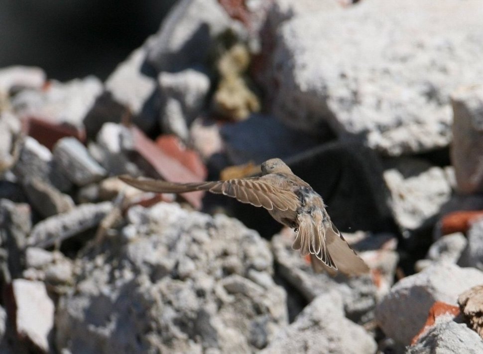 Beskrivelse: Billedet viser måske noget om fældning - om evt. slidte fjerspidser på hale og svingfjer? (Beklager det middelmådige billede og især at hovedet ikke kan ses, men fuglen er rapid i flugten...)