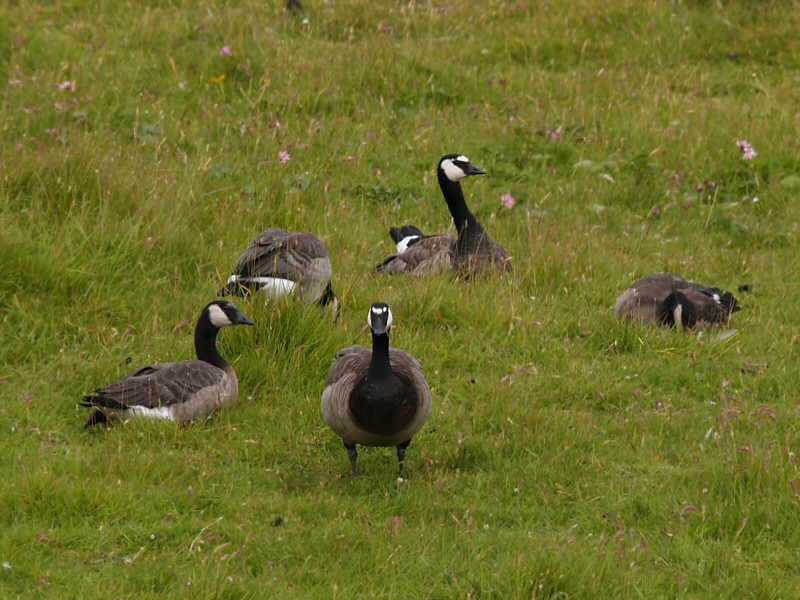Beskrivelse: En mærkelig familieflok af canadagæs. Læg mærke til variation i hovedtegning. Er nogle måske hybrider?
