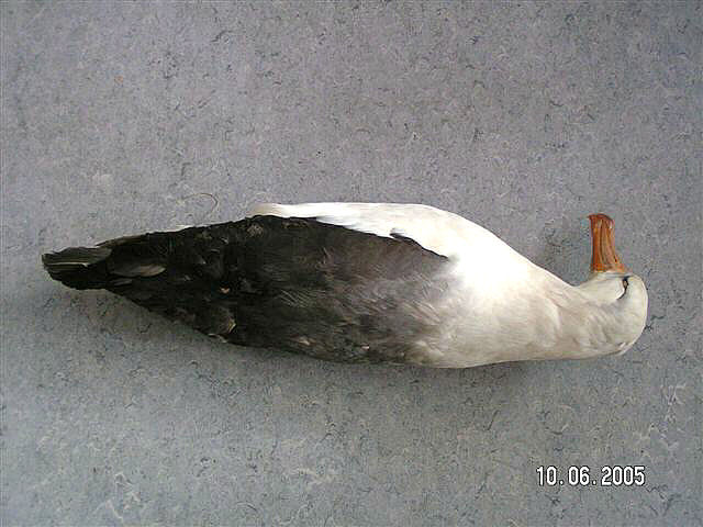 Beskrivelse: Denne sortbrynede albatros opholdt sig i sulekolonien på Mykines Hólmur fra 1860 - 11. maj 1894, hvor den blev skudt. Det er en ad. hun. Skindet ligger på zoologisk museum i København.