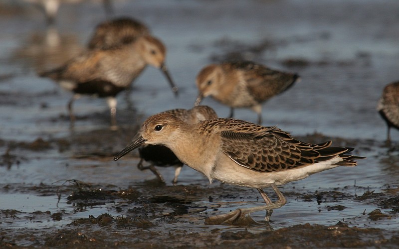 Titel: Ruff (Philomachus pugnax), dunlins on background