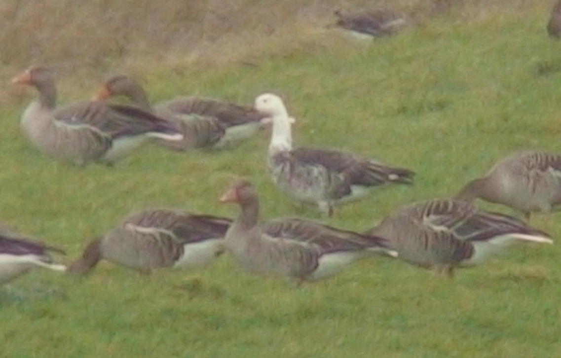 Der er noget galt med den gås. Der er for meget hvidt på halsen og for lidt hvidt på bugen til at det kan være en "blågås". Kan det ikke være en hybridgås af en eller anden slags?