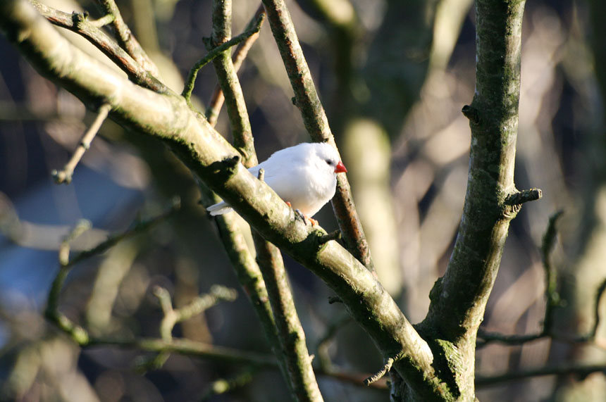 Det er en Zebrafinke (Taeniopygia guttata castanotis)i den mutationsfarve der hedder Hvid blandt opdrættere.