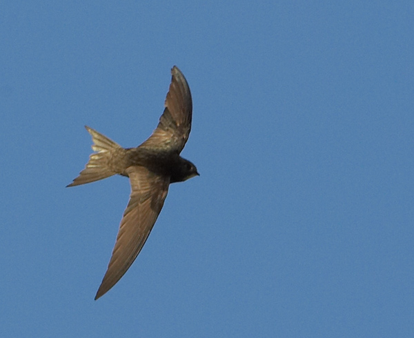 Det ser ud som om at den har fældet de 3 yderste armsvingfjer og ovenliggende store dækfjer, disse fjer er tydeligvis meget mørkere (Mursejlerfarvede) end de gamle som er lysere grundet slid. Så mon det ikke er en Mursejler.