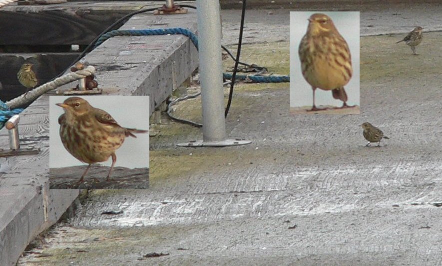 Jeg vil også, som Rune, mene at kun fuglen oppe i højre hjørne kan være Bjergpiber. De øvrige har smudsiggrumset bundfarve på brystet, hvorimod den nævnte er mere renere hvid med mere distinkte (og ikke udflydende) mørke striber. Kan også fornemme to lyse vingebånd og kraftig øjenbrynsstribe.