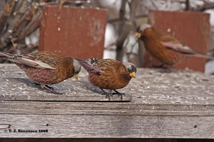 Beskrivelse: Normalt er Gray-crowned Rosy-finch og de to andre nordamerikanske Rosy-finch arter temmelig besværlige at have med at gøre. Om sommeren holder de til højt over trægrænsen på utilgængelige stenskrænter og man ser dem oftes kun i korte glimt. Om vinteren er det normalt endnu vanskeligere at få dem at se, i hvert fald i Alberta. Men denne vinter er det anderledes. Alene i den lille Rocky Mountains landsby Exshaw er der en stationær flok på over 1000 fugle! Og i alt er der set over 10000 individer i Alberta siden nytår!