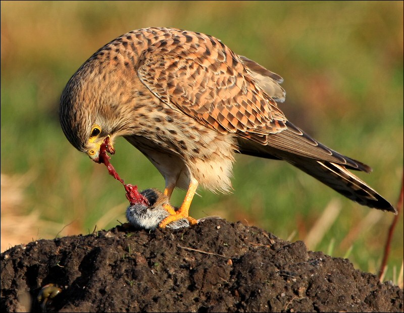 Beskrivelse: Tårnfalken fjerner altid musens indmad, der kasseres og efterlades til glæde for krager, skader, Iberiske skovsnegle og andre opryddere efter "skovsvin".