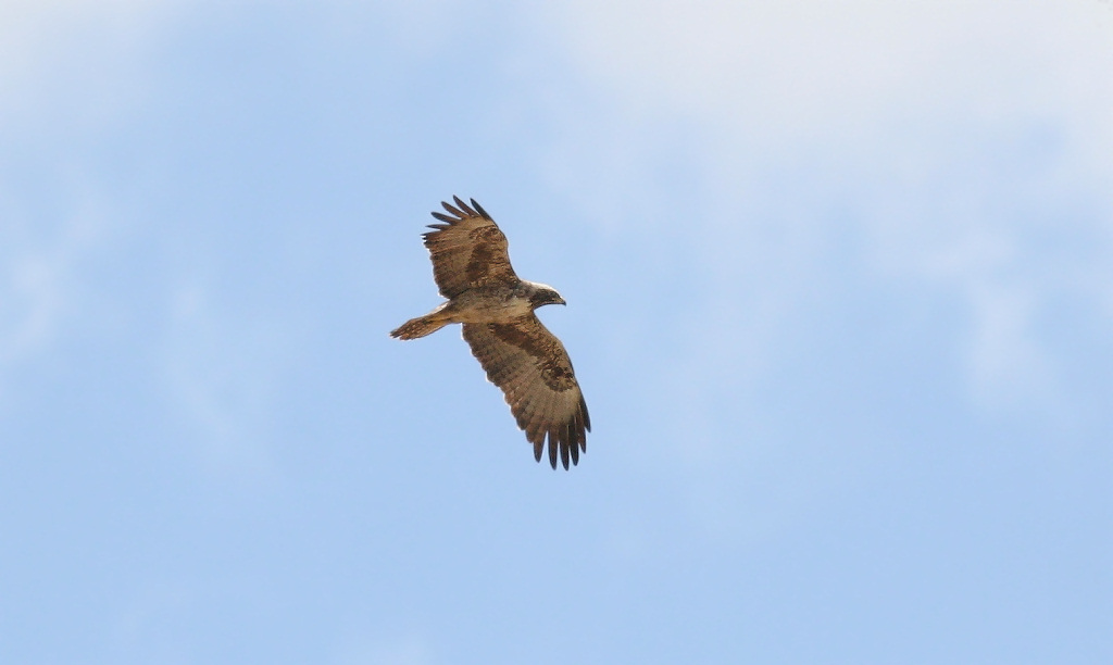 brede sorte spidser på hale- og svingfjer. Umiddelbart ingen rufous farve på dækfjerene, og så har den mørk strube, hvad African Hawk-Eagle normalt ikke har i nogen dragter. En mystisk fugl for det er vel en African Hawk-Eagle?