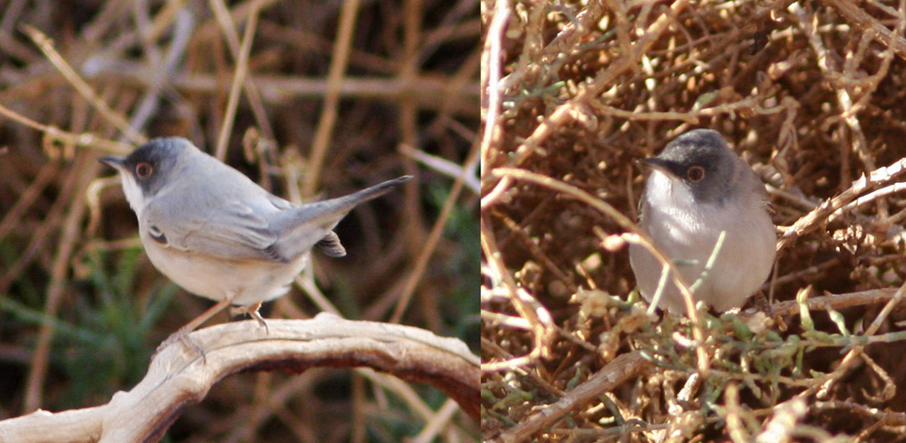 Beskrivelse: Denne fugl var meldt ud som rosenbrystet sanger (2K han) af lokale i Eilat. Kendetegnede var dog til dels tvetydige (dragten kan forveksles med sorthovedet sanger): Bemærk hvordan især grundfarve varierer alt efter om fuglen sidder i skygge eller i direkte lys, og fordi kameraet stod på automatisk valg ad farvetemperatur, der har givet en række forskellige nuacer.