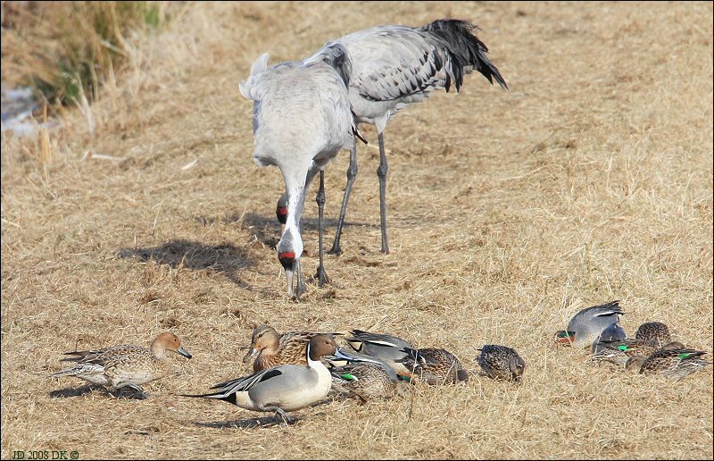 Beskrivelse: Tranerne er vist tidligt på den i år - 8.600 var på plads ved "Tranedansen" denne dag i marts - men også spidsand, som her er i selskab med bl.a. krikand, gråand og naturligvis traner.