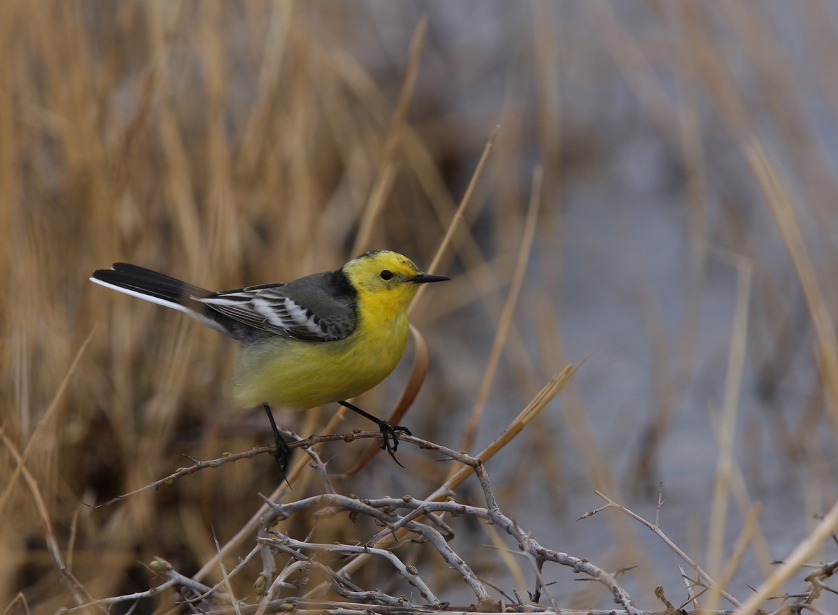 Beskrivelse: En blæsende kølig formiddag i begyndelsen af april. Umiddelbart få vandfugle (som ligger i læ af rørskoven). Et pludseligt mylder af fouragerende vipstjerte langs søbreden akkompaigneret af lavtflyvende svaler. 10, 15, 20 vipstjerter. Et par enkelte udfarvede calcarata-Citronvippere - upåklageligt sortryggede. Men også andre mere opmærksomhedskrævende hanner (se billederne af hannerne fra samme dato)- gudsjammerligt lignende gennemtrækkende citreola-Citronhanner. Gennemtrækkende fordi ssp citreola yngler hundredevis kilometer længere nordpå - på steppen; og derfor mulige trækgæster. Er det hanner citreola eller kan det være calcarata. Hunnerne kan ikke racesbestemmes: grå overside, kraftig gul supercilium som omkranser øredækkerne, tydelige hvide wing-bars, gullig underside (kraftigs på øvre bryst og strube) gradvist lysere længere bagud - mod undergumpende. Udfarvede Citronhanner byder nixen på problemer, men som Alstöm skriver i Pipits and wagtails. In all other plumages (than adult summer-males and 1.summer-males), citreola and calcarata are generally not safely distinguishable in the fields. Hvorfor har de udfarvede Citronhanner, mørke tegninegr på issen? Hvorfor har hunnerne tydelige mørke tegninger på øvre bryst? Citronhannerne lyser blændende op denne gråvejrsdag - den ene efter den anden foretager raids lavt hen over vandfladen - stopper og "muser" mens de napper insekter fra søens overflade. Ikke blot tilfældigvis. nej gang på gang, foretager vipstjerterne denne flyvning, og går tydeligvis efter crashede insekter på vandet. Ser sjovt og også lidt komisk ud som de kæmper mod den kraftige vind med deres flagrende former inden de dumper ind i rørskovens læ: Lidt som at se Steen Brølling flagre forgæves efter bolden på Vesløs stadion en lun augustdag.