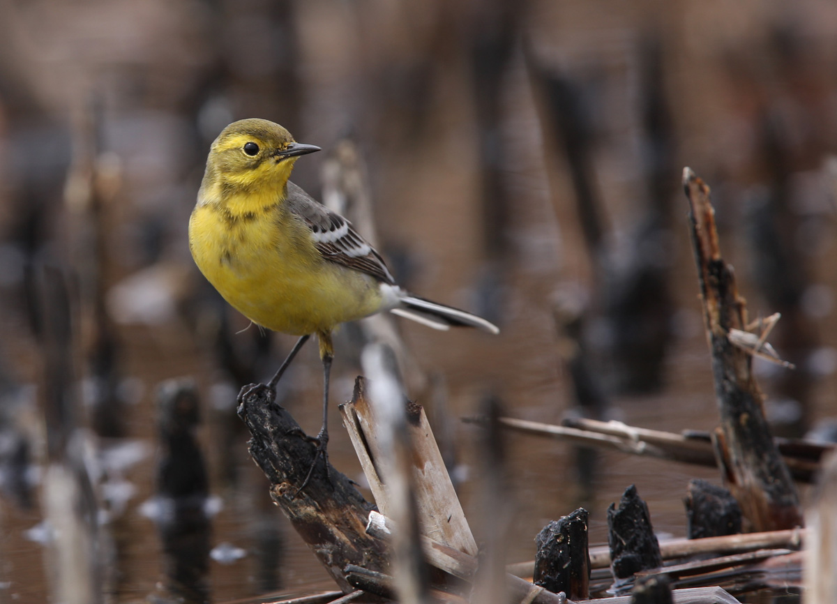 Beskrivelse: En blæsende kølig formiddag i begyndelsen af april. Umiddelbart få vandfugle (som ligger i læ af rørskoven). Et pludseligt mylder af fouragerende vipstjerte langs søbreden akkompaigneret af lavtflyvende svaler. 10, 15, 20 vipstjerter. Et par enkelte udfarvede calcarata-Citronvippere - upåklageligt sortryggede. Men også andre mere opmærksomhedskrævende hanner (se billederne af hannerne fra samme dato)- gudsjammerligt lignende gennemtrækkende citreola-Citronhanner. Gennemtrækkende fordi ssp citreola yngler hundredevis kilometer længere nordpå - på steppen; og derfor mulige trækgæster. Er det hanner citreola eller kan det være calcarata. Hunnerne kan ikke racesbestemmes: grå overside, kraftig gul supercilium som omkranser øredækkerne, tydelige hvide wing-bars, gullig underside (kraftigs på øvre bryst og strube) gradvist lysere længere bagud - mod undergumpende. Udfarvede Citronhanner byder nixen på problemer, men som Alstöm skriver i Pipits and wagtails. In all other plumages (than adult summer-males and 1.summer-males), citreola and calcarata are generally not safely distinguishable in the fields. Hvorfor har de udfarvede Citronhanner, mørke tegninegr på issen? Hvorfor har hunnerne tydelige mørke tegninger på øvre bryst? Citronhannerne lyser blændende op denne gråvejrsdag - den ene efter den anden foretager raids lavt hen over vandfladen - stopper og "muser" mens de napper insekter fra søens overflade. Ikke blot tilfældigvis. nej gang på gang, foretager vipstjerterne denne flyvning, og går tydeligvis efter crashede insekter på vandet. Ser sjovt og også lidt komisk ud som de kæmper mod den kraftige vind med deres flagrende former inden de dumper ind i rørskovens læ: Lidt som at se Steen Brølling flagre forgæves efter bolden på Vesløs stadion en lun augustdag.