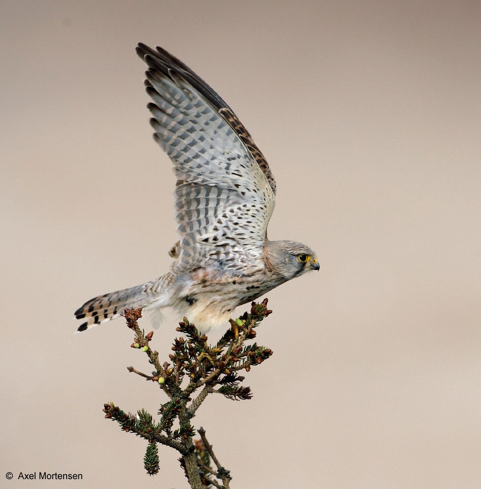 Beskrivelse: Tårnfalken sad i et grantræ på skråningen med sandstranden som baggrund. Da den dykkede efter et bytte, trykkede jeg.