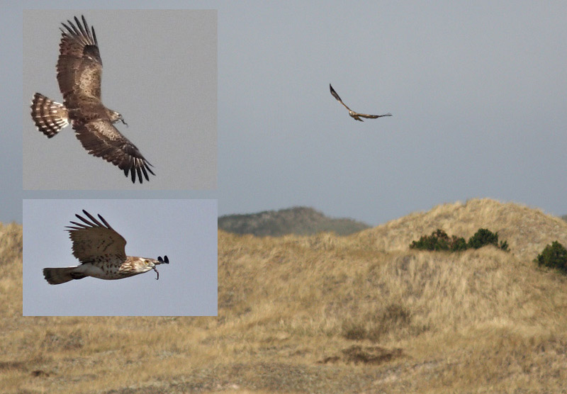 Beskrivelse: Ørnen blev set trække sent 4/5. Allered om morgenen ved 8-tiden dagen efter var den ude og vende syd for flagbakken. Jeg sad og ventede på Flagbakken - men meldingerne viste kun at fuglen bevægede sig langsomt mod SV. Jeg så den fra Hulsig Hede langt mod SV. Så satsede jeg og gik ind på Hedens SV-lige del uden at kunne se fuglen. Pludselig dukker den op 100 m foran med en snog el.lign i næbbet og flyver rimelig tæt forbi mod NØ. Jeg returnerede til Flagbakken og kunne nyde ørnen igen - den trak såmænd forbi da jeg havde sat mig til rette - dejlig oplevelse.