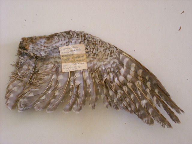 Beskrivelse: Denne vinge stammer fra den Høgeugle som opholdt sig kort tid ved Nordre Ringvej i Vestskoven. Den havde åbenbart taget et smut til Fabriksparken, Glostrup hvor den desværre endte sine dage. Dvs. at der opholdt sig op til 4 Høgeugler i Vestskoven 1983/84. 2 Ved Oxbjerget, 1 Nordre Ringvej (trafikdræbt) og 1 ved Trippendal Skovfogedsted (= Ro/Rovej).