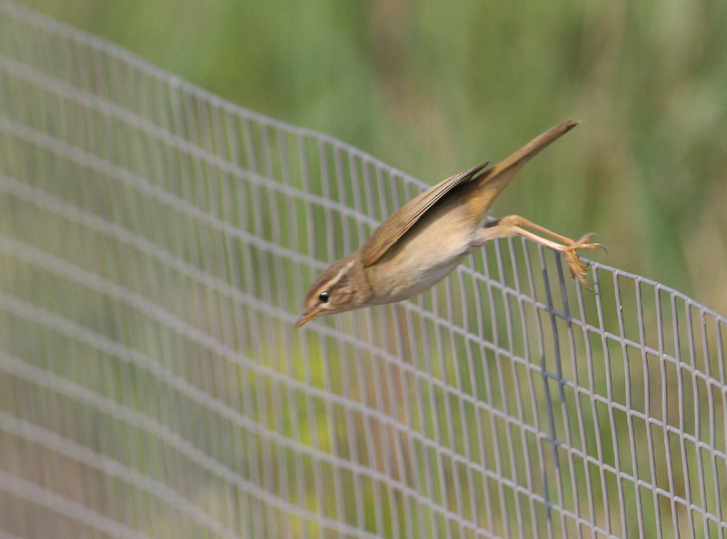 Beskrivelse: En Schwarz Løvsanger tager springet. Af kendetegn ses her især de lyse, brede ben (der er velegnede til at hoppe på rundt på jorden med, hvilket arten da også gør mere regelmæssigt end de fleste andre sangere) - samt den gulbrune undergump, i kontrast til den lysere bug, der giver en effekt af, at fuglen har "gjort" i bukserne.