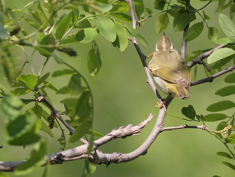 Beskrivelse: Set bagfra er Østlig Kronsangers lyse kronestribe imod de mørke issesider meget tydelig og giver et førsteindtryk som en enormt stor udgave af Fuglekongesanger.
