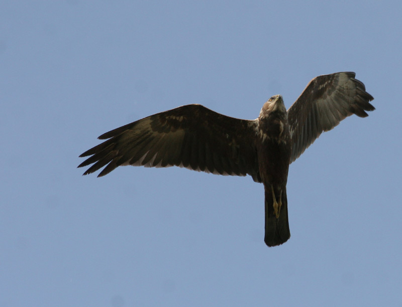 Her er en yngre (evt. 2k) hun Eastern Marsh Harrier, hvor man kan se undervingens lighed med Rørhøgens. Jeg har checket flere ikke offengliggjorde fotos af yngre - mørke og rørhøgelignende - hunner, og kan bekræfte, at yngre fugle højst har meget svage tværbånd på svingfjerene - oftest ser ingen tværbånding.