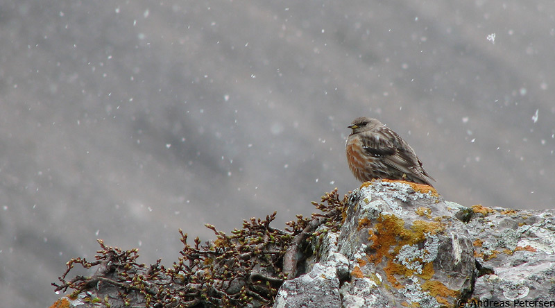 Det er et lækkert billede med en flot stemning. Mosset på stenene matcher fuglens rødorange farver og himlen er grå, fuglen er grå og stenene er grå. Smukt!
