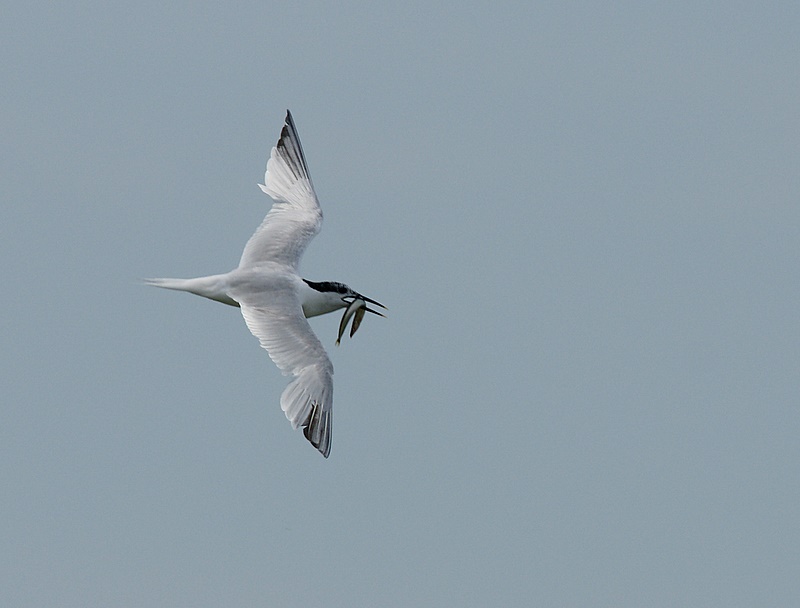 Beskrivelse: Dens ene unge sad på en sten et stykke ude i vandet. Jeg ved ikke hvad det er for en fisk, men det er da et pænt måltid.
