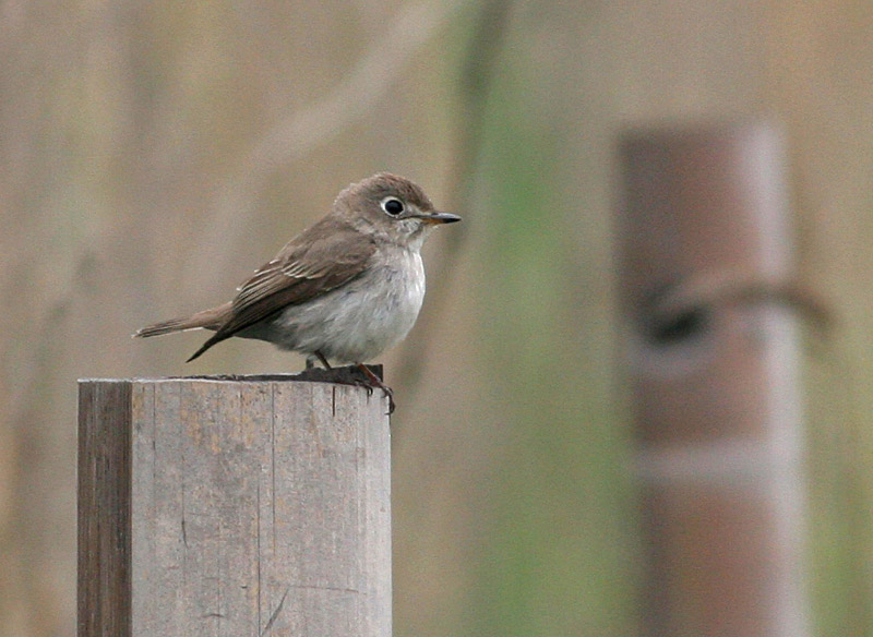 Beskrivelse: Brun Fluesnapper -der er truffet én gang i Danmark - er en af de arter, der skal kigges efter om efteråret. Den er ikke specielt svær at kende, og ligner ikke Grå Fluesnapper specielt meget. Her ses den lyse underside (højst med meget svage skygger på flaker og bryst), den brede hvide øjenring og den brede gule næbrod - samt vingefjerenes smalle,lyse kanter.