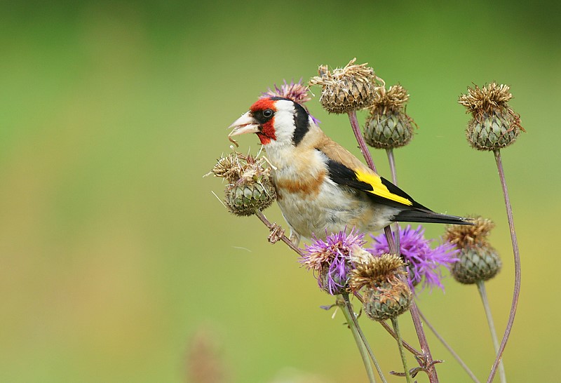 Beskrivelse: Det går stærkt når stillitsen rydder frøene fra de afblomstrede knopurter.