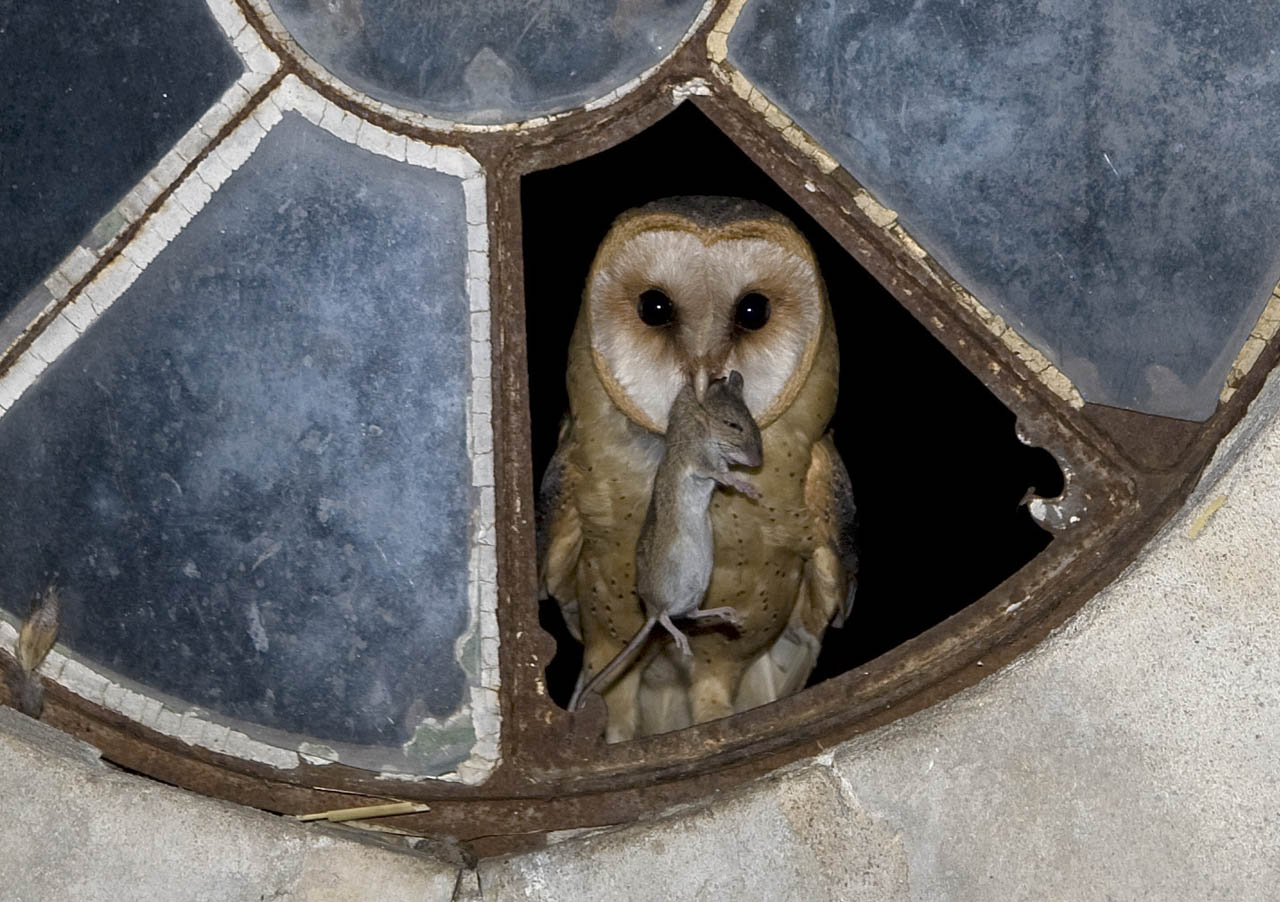 Du har gættet helt rigtig. Uglen yngler i en opsat kasse inde i laden, så jeg måtte aflure parret hvilken vej de benytter, når de om natten kommer med mus til deres 5 store unger. Jeg håbede de benyttede den manglende rude i det flotte vindue (ruden er for flere år siden blevet fjernet for uglerne skyld), og heldigvis havde jeg gættet rigtigt.