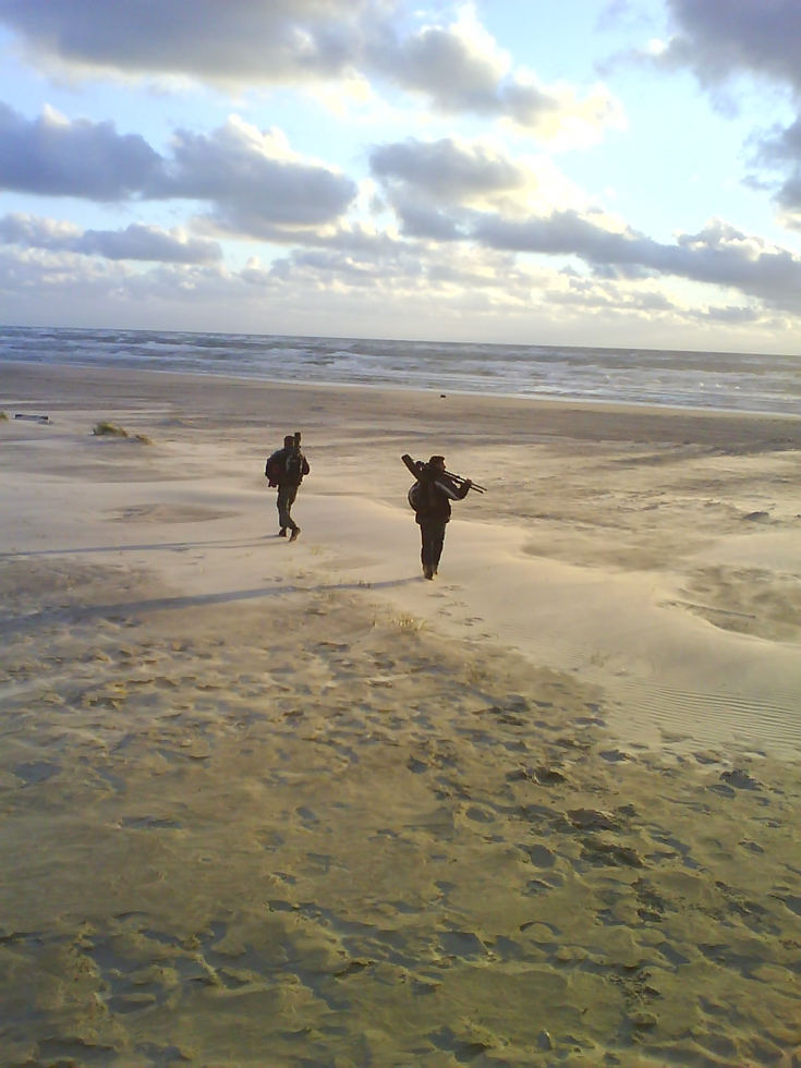 Beskrivelse: Jonas Gadgaard og Henrik Böhmer på vej tilbage fra aftenobs i Sabinebunkeren. En obs bl.a. gav 4 Sodfarvede og 4 almindelige skråper.