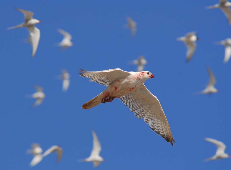Tak for roserne. Falken har ovenikøbet flagets farver. Jagtfalken som her er foto af dukkede op samme morgen og slåg en ederfugl, som den tog blodbad i. Derefter cirkede den rundt om mig flere gange, og jeg har faktisk en hel serie fotos, hvoraf andre også er seværdige, med lidt anderledes vingestilling osv., så det var lidt svært at vælge netop dette. Falken returnerede for at æde resten af ederfuglen og blev set i de følgende 4 dage. Senere dukkede to andre jagtfalke op hver for sig, idet de slog omtrent flyvefærdigeunger af havterne og en enkelt gammel havterne der var uforsigtig nok til at flyve under jagtfalken. Men ved alle følgende situationer var lyset og afstanden ikke så lige så god.