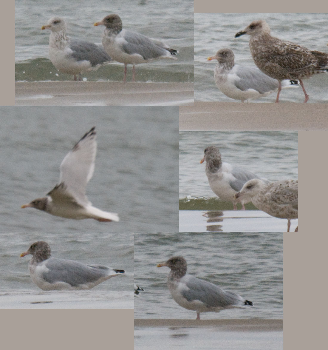 Beskrivelse: Denne måge fandt jeg højst mærkværdig og jeg har kigget i "Gulls" for at finde en der ligner. Jeg har ikke før set en Sølvmåge med så mørk tegning i hovedet i vnterdragten. Derfor bemærkede jeg den og prøvede at få nogle billeder. Nu kan jeg også på billederne se, at det er meget lidt af vingespidserne der er sorte. Kun de to yderste håndsvingsfjer. Det passer på en Thayers Måge, men er det det ? Det runde hoved, som også kendtegner en Thayers Måge, synes jeg dog ikke jeg kan se, men det kan jeg nu heller ikke på nogle af de billeder af Thayers Måge, der er i "Gulls". Nogle eksperter der kan hjælpe med denne mystiske måge ?
