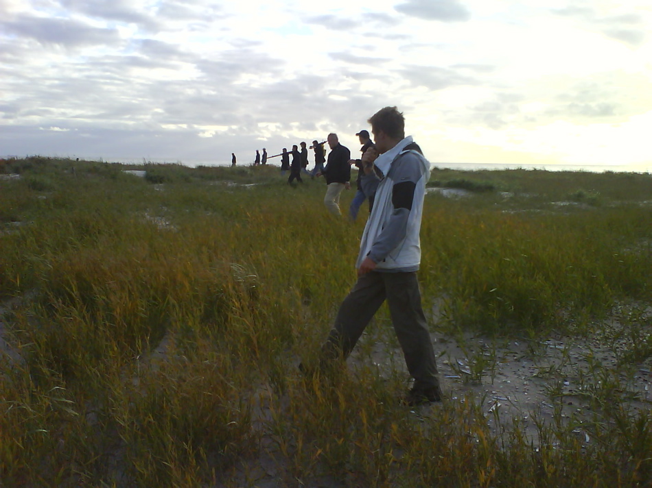 Beskrivelse: Aftentramp på Grønningen. En gruppe fortsatte syd på, efter en Græshoppesanger var bestemt. Under dette tramp blev der fundet en død Storkjove pg en død Sule.