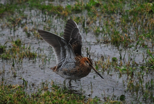 Beskrivelse: Det Færøske Dobbeltbekkasin (Gallinago gallinago faeroeensis) viser typisk rødbrunt hoved,bryst og ryg som denne fugl, men der er dog stor farve variation blandt den Færøeske bestand.