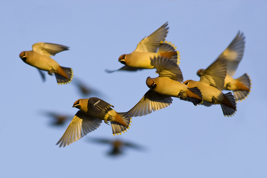 Et skønt billede af en fugleflok, hvor individerne - i fuld fart fremad -hver især markerer sig i deres opmærksomhed og aktioner. Sjældent!