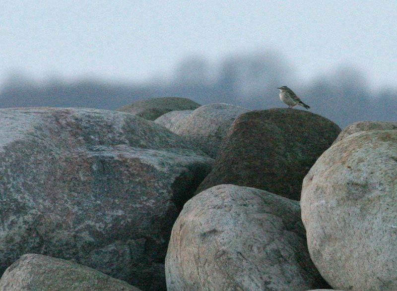Beskrivelse: Et fjernfoto, der viser Bjergpiber i sin lettest bestemmelige form. Tydeligt hvidt øjenbryn, to brede hvide vingebånd og gråhvid underside med ret smalle, men distinkte mørke striber.