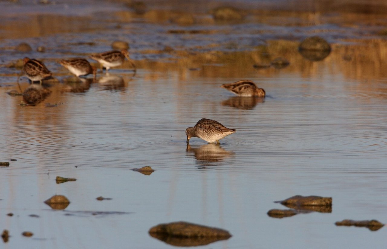 Beskrivelse: Oversigtsbillede som på det nærmeste er ubeskåret. Viser at dobbeltbekkasinerne typisk fouragerer tættere på bredden end fuglen her.