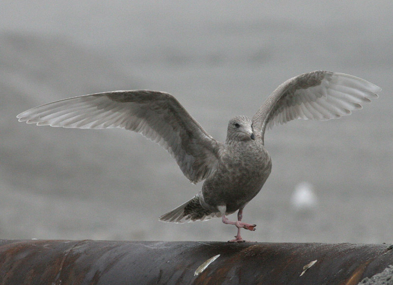 Beskrivelse: Gråmågen i Hundested, Bemærk den afvigende mørke tegning på håndsvingfjerene, der danner en kort, mørk vingebagkant, der ikke er normen hos Gråmåge men antyder, at der måske er Sølvmåge i fuglen.