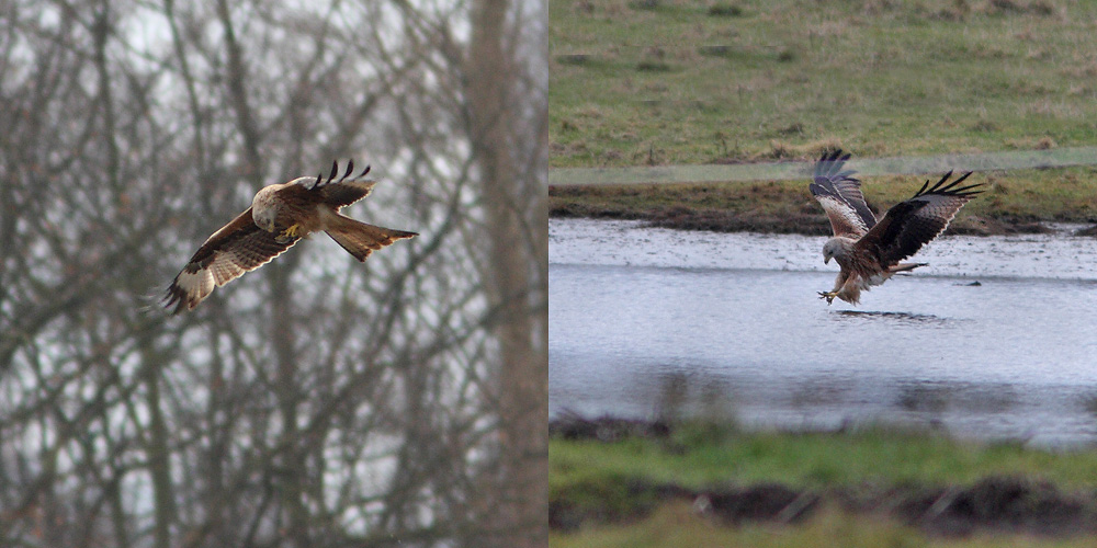Beskrivelse: Denne Røde Glente var i gang med en død hare sammen med en Musvåge, som jeg uforvarende skræmte, da jeg rundede et buskads, hvor de sad og åd. Den røde glente fløj ud over det oversvømmede område, hvor den pludselig dykkede og tog et eller andet, som jeg formoder var en død mus (anes på billedet til venstre).