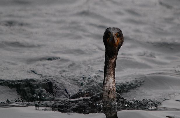 Beskrivelse: Skarv svømmende direkte mod mit kamera.