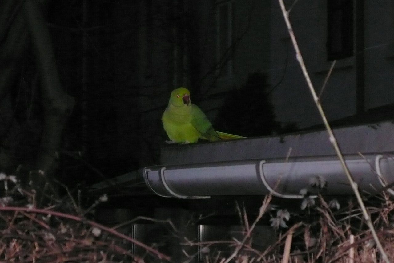 Beskrivelse: Alexanderparakit (lille?) der sad i min have på Amager her i sneen forleden. Fløj væk efter ca. 10 min. hvor jeg kunne komme ganske, men ikke helt tæt på.