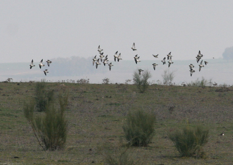Beskrivelse: Stepperne mellem Trujillo og Caceres i Extremadura er blandt de bedste lokaliteter for åbenlandsfugle som trapper og sandhøns. En kort vejledning til det sted, hvor fuglene er fotograferet: fra hovedvejen mellem Trujillo og Caceres - ca. 20 km. vest for Trujillo - drejes ad vej mod Santa Marta de Magasca. Det første sted, vejen slår et sving mod venstre, byder på et storslået view over stepperne og fuglene. Udover denne flok spidshalet Sandhøns (der i modsætning til Sortbuget Sandhøne optræder i større flokke) sås begge trapperne let - bl.a. 37 stortrapper i samlet flok.