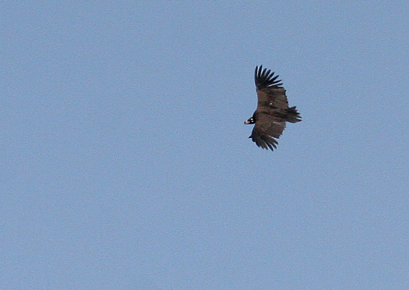 Beskrivelse: Også fra oversiden er munkegribben særdeles mørk. Med sine lange, let hængende vinger og moderat lange hale kamn den i formen minde en del om en meget stor ørn - en tanke, der sjældent opstår når man står over gåsegribben, der er tofarvet, extremt korthalet og kredser på højt løftede vinger.