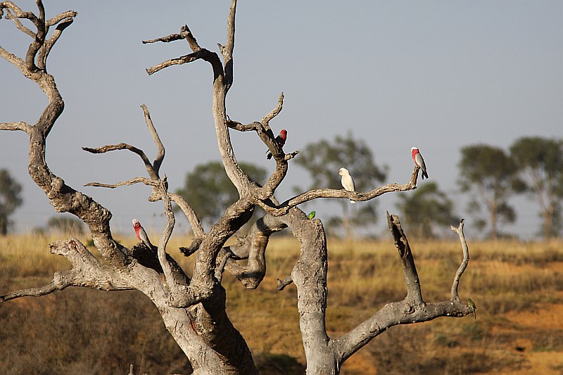 Jeg har fundet seks gøjer, som jeg bestemmer således: to Galah'er, en Long-billed/Little Corela, en King Parrot (han) og Red-rumped Parrot han og hun.