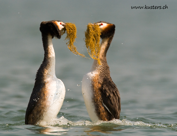 The two birds in love dive for nesting material and swim towards each other. When they meet, they rise up together as if they're standing on the water facing each other, beaks full of vegetation, waving their heads from side to side and paddling like fury with their feet.