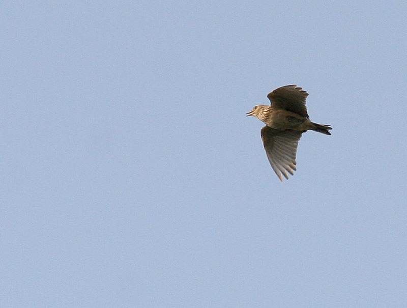Beskrivelse: Lille Sanglærke er tydeligt mere kompakt med kortere hale end Sanglærke, og ligner i formen mere en Hedelærke. I flugten er manglen på hvid vingebagkant tydelig.