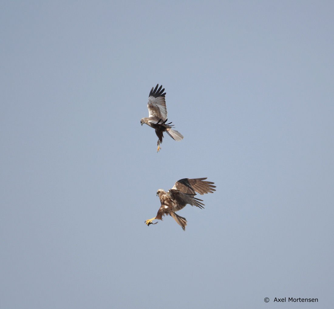 Det er meget spændende af følge forløbet, når hannen flyver ind med byttet, og hunnen skyder op fra rørskoven for at hente det.