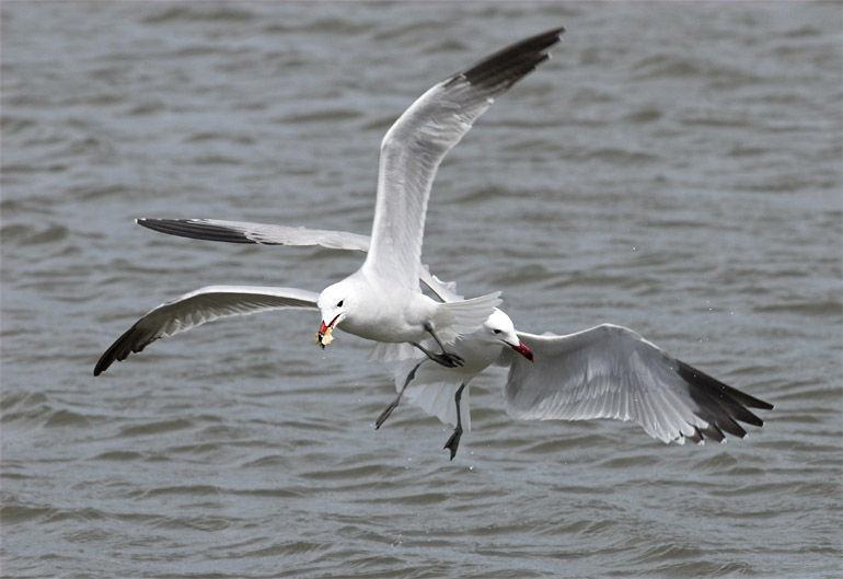 Beskrivelse: Da en lokal lystfisker kastede håndfulde af pomfritter ud,dukkede hele 7 Audouinsmåger ud af intet og fouragerede løs.