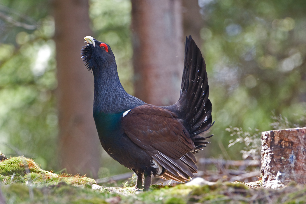 Beskrivelse: Fik et tip af en svensk fotograf om denne fugl. Jeg prøvede efter hukommelsen at finde stedet men var ikke helt sikker på, om jeg var kørt det rette sted hen. Jeg var heller ikke for optimistisk, om jeg ville kunne finde den midt på dagen....og....det gjorde jeg heller ikke. Den fandt mig først ! Jeg var netop på vej ind ad et lille spor, da tjuren pludseligt stod foran mig, og så kan det nok være, at jeg blev jaget på porten med fuld musik !!! Det må have set sjovt ud: en velvoksen mand med en 500 mm under armen i vild flugt ud af skoven med en kåd tjur i røven !