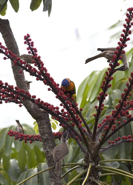 Beskrivelse: To Helmeted Friarbirds (nederst i midten hhv. øverst til højre) sammen med en Red-collared Lorikeet (Trichoglossus rubritorquis) i midten, en Rufous-banded Honeyeater (Conopophila albogularis) nederst til venstre, samt sandsynligvis to Little Friarbirds (Philemon citreogularis) øverst til venstre.